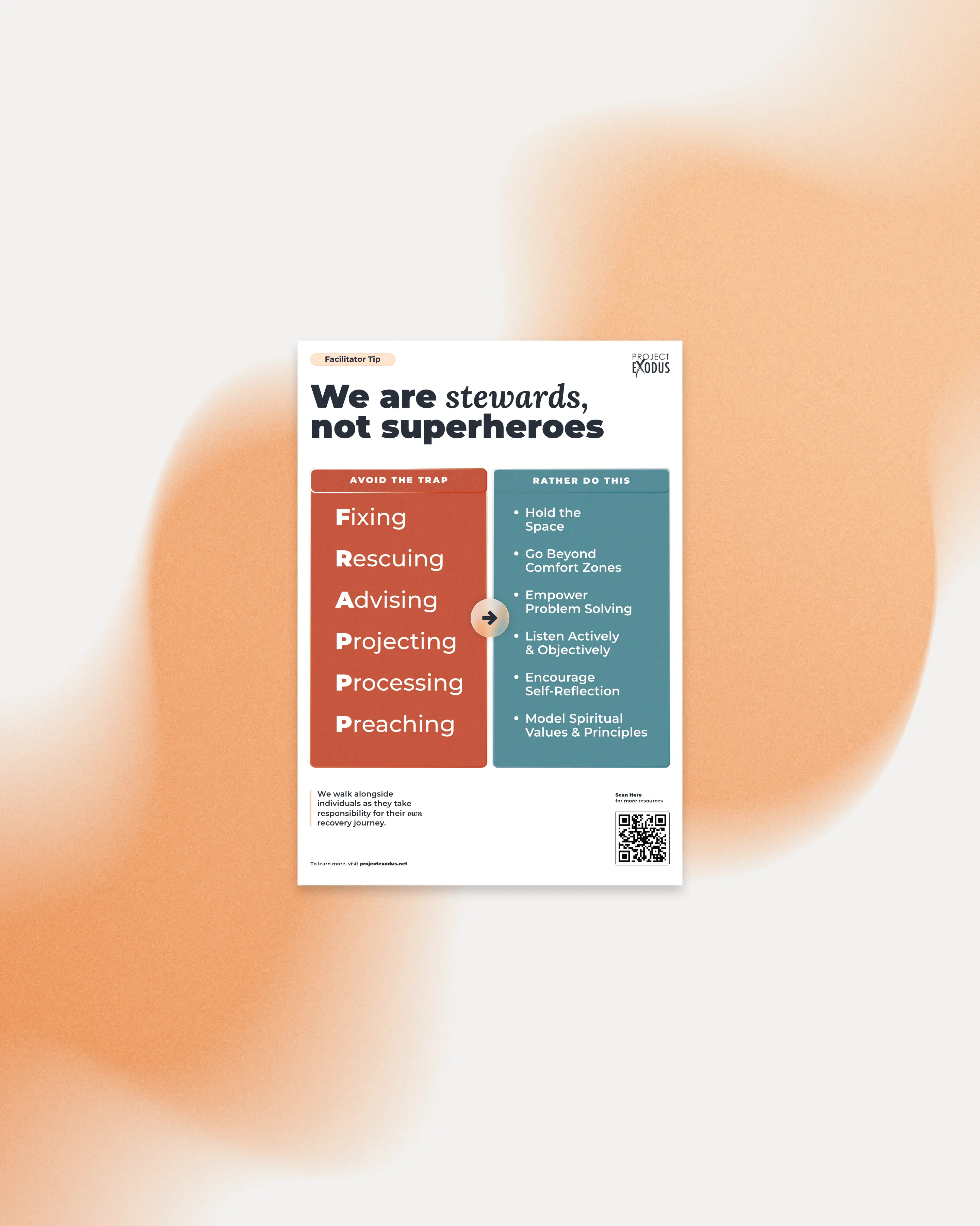 When facilitating, it is easy to fall into the trap of wanting to save everyone. This "Facilitator Tip" poster provides a vital reminder that we are called to be stewards, not superheroes. The guide visually contrasts the "FRAPPP" trap (Fixing, Rescuing, Advising, Projecting, Preaching) with the healthy behaviours of an effective facilitator. Use this resource to maintain healthy boundaries and model spiritual values effectively.